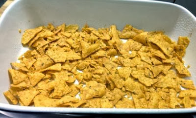 Spread the nachos evenly on the bottom of the dish.